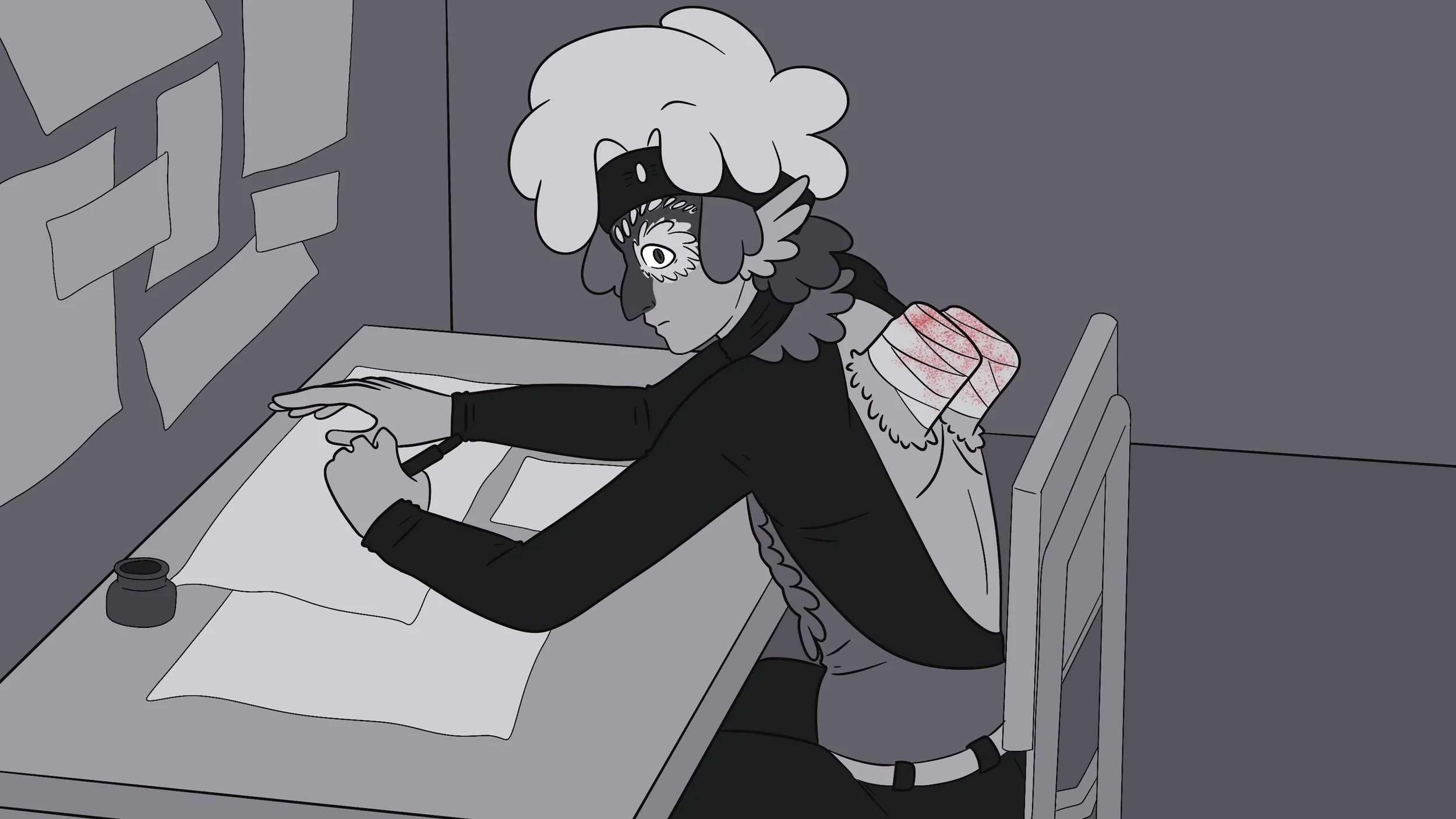 Backstory: Andreas is an avian in exile, a former celebrity in the avian world for his contributions to the medical field and for his study of healing and medicinal magic, teaching many of the medical magic courses himself. After suffering an injury to his wing in an active battlefield, he begins to study imbuing magic in an attempt to heal.