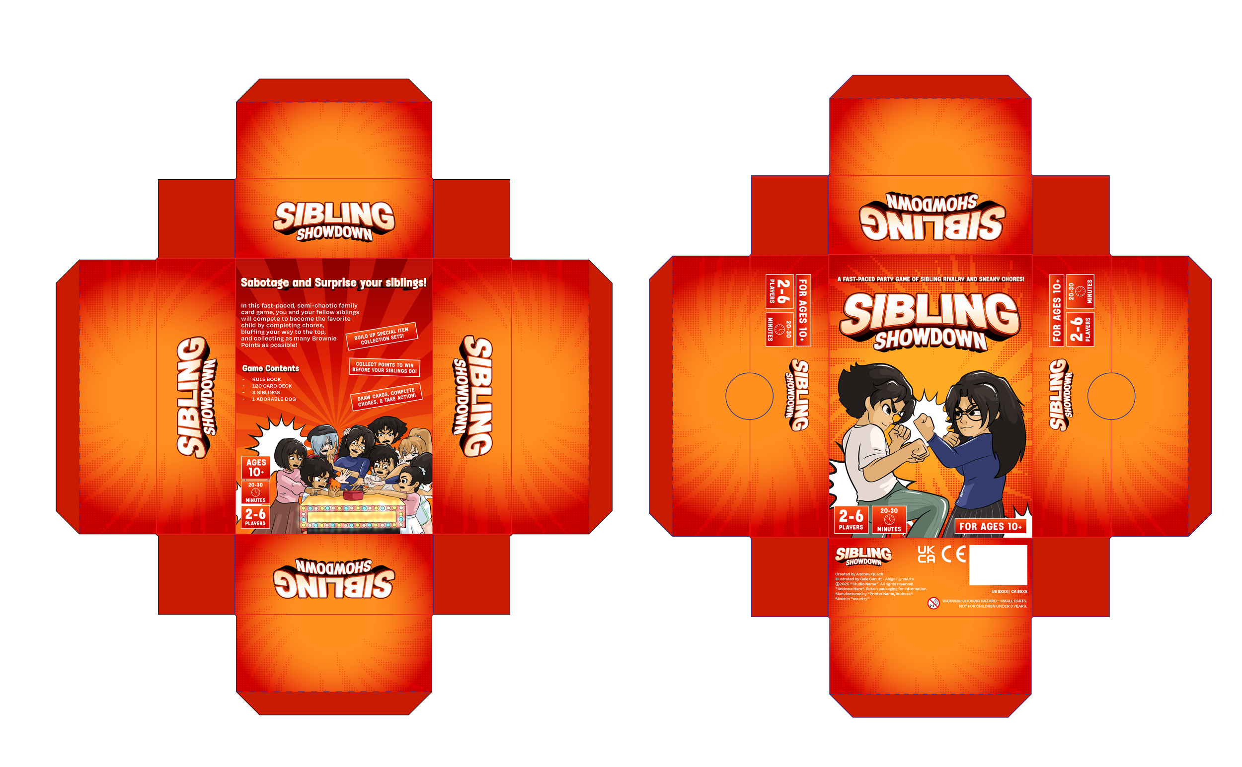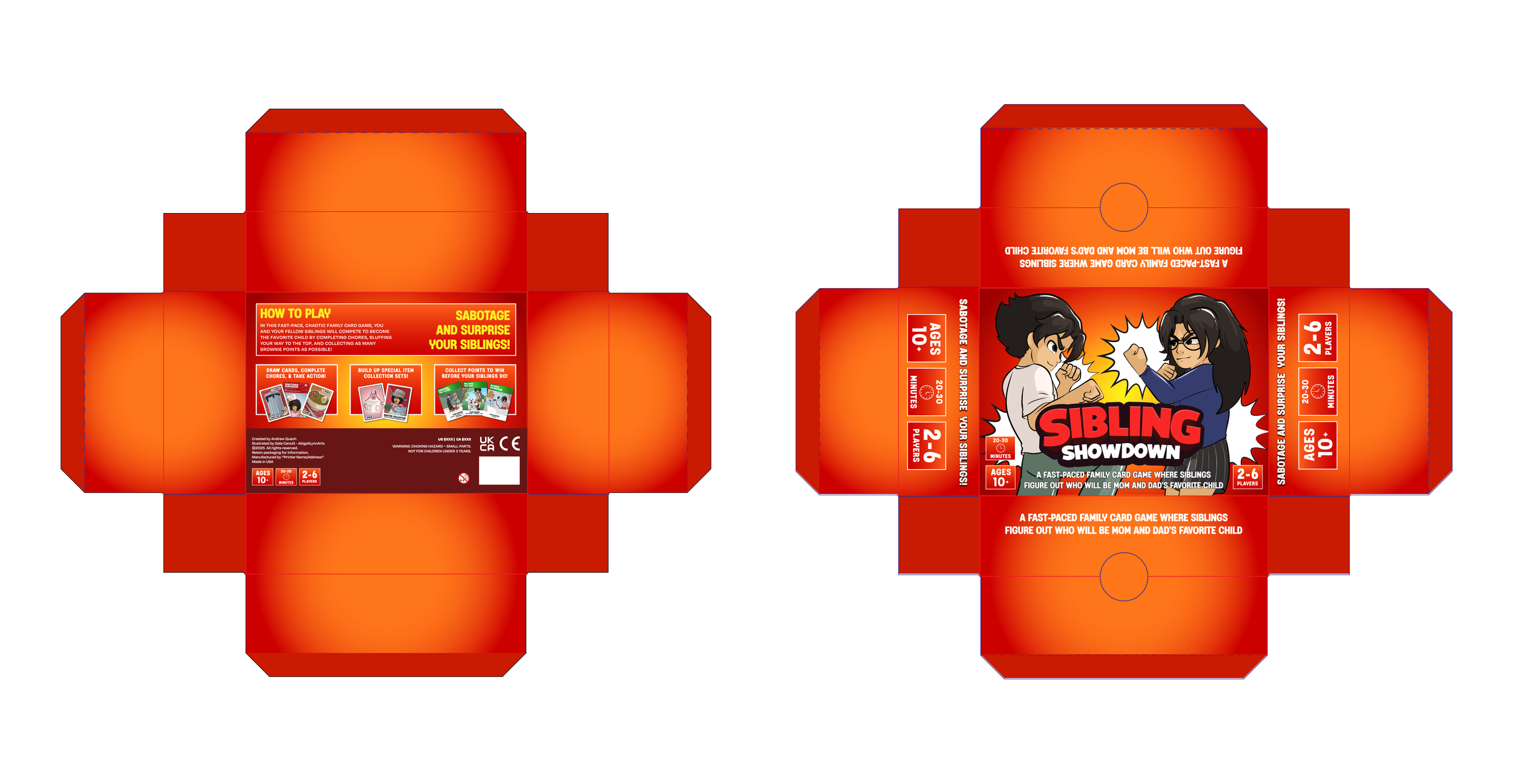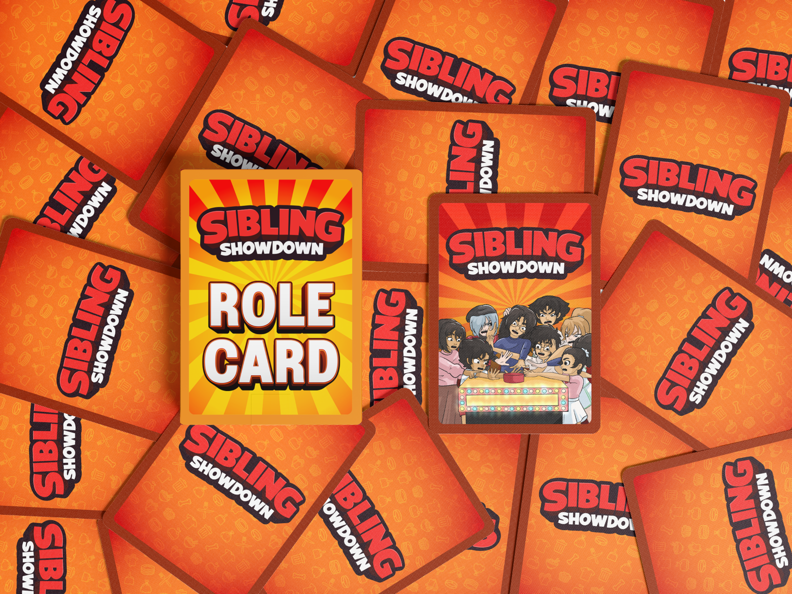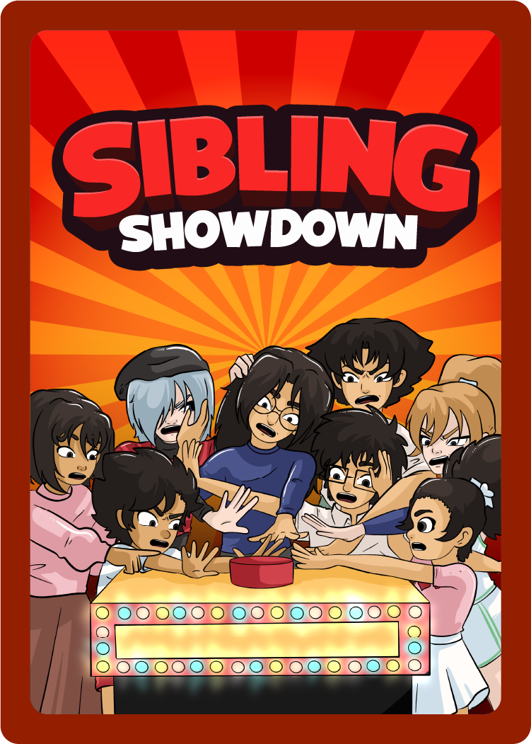 Sibling Showdown is a brand new, fast paced card game for family and friends where players fight to collect items, complete tasks, and earn points to become the best “sibling” in the family. It’s an action packed experience that includes bluffing, stealing cards, playing attack and defense cards, and completing chore cards!
