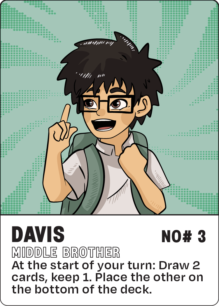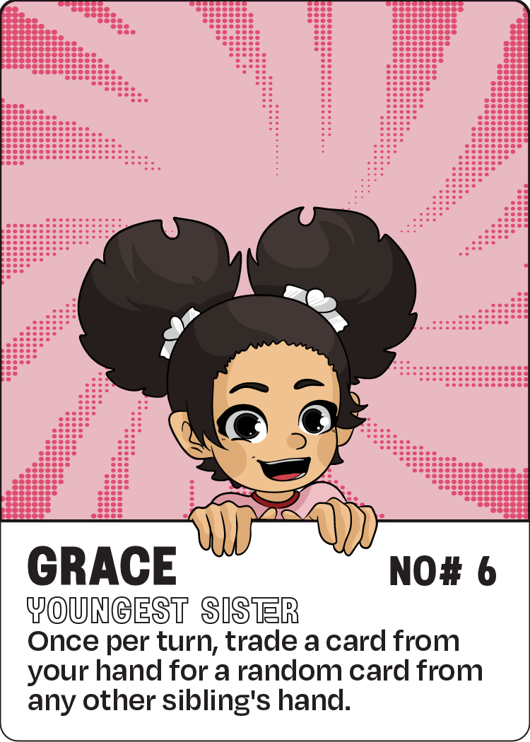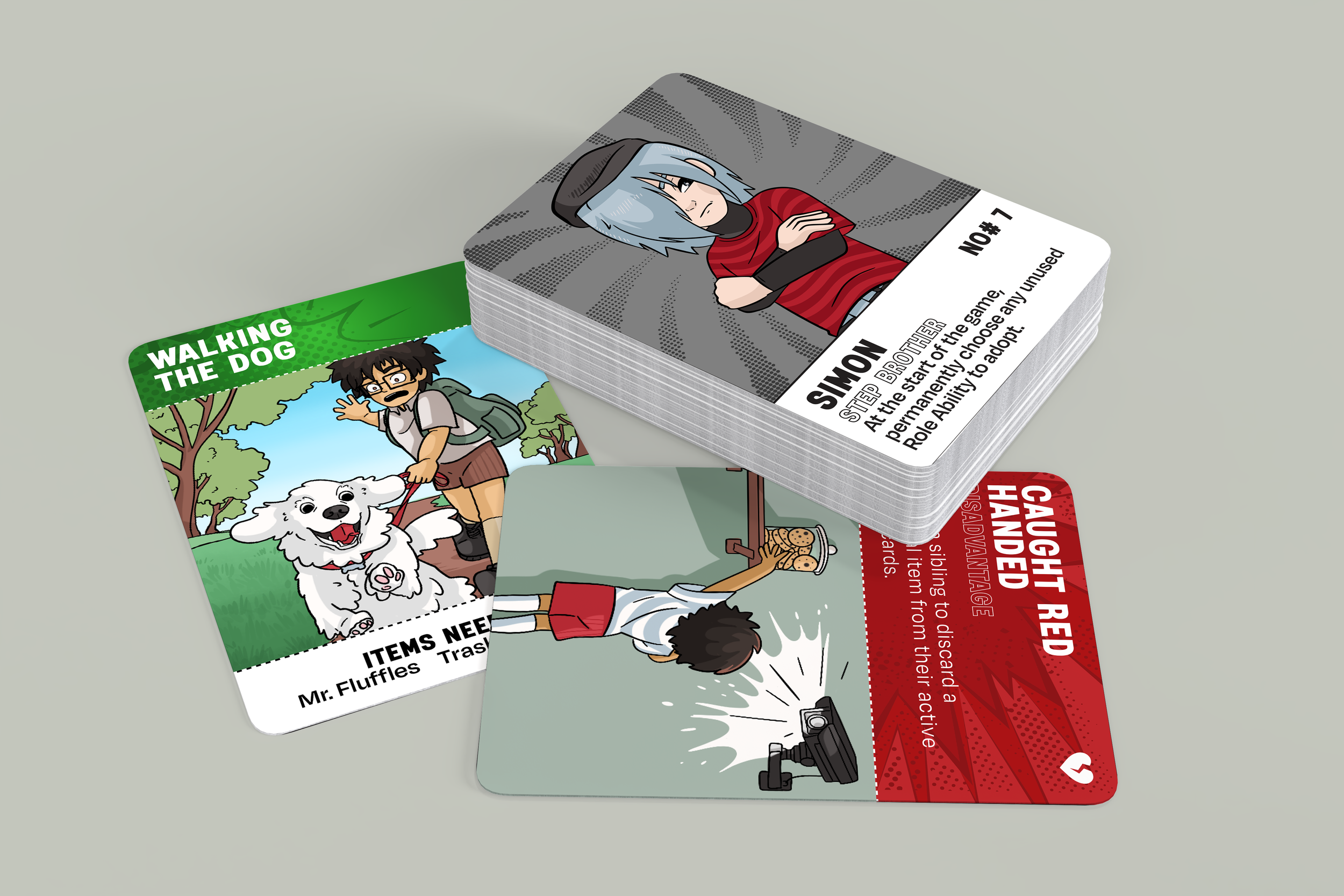 This project challenged me to create a new custom character design style outside my normal illustration style, illustrate many conventional (and not so conventional) items, and create scenes and character interactions. I also created and pitched branding concepts for the game, developed the packaging, arrange the layout of the cards, and created a cast of eight unique siblings each with different special powers in collaboration with the game’s developer.