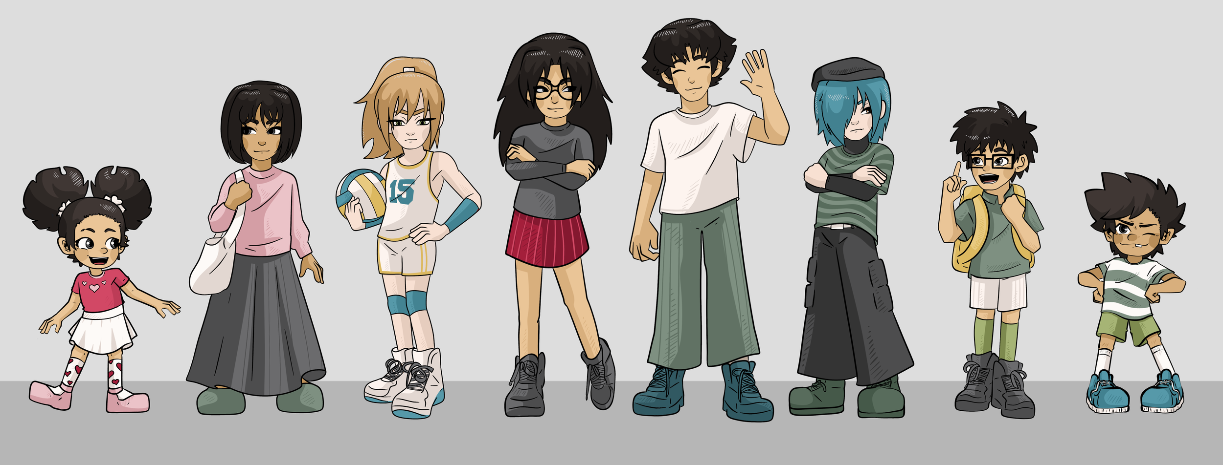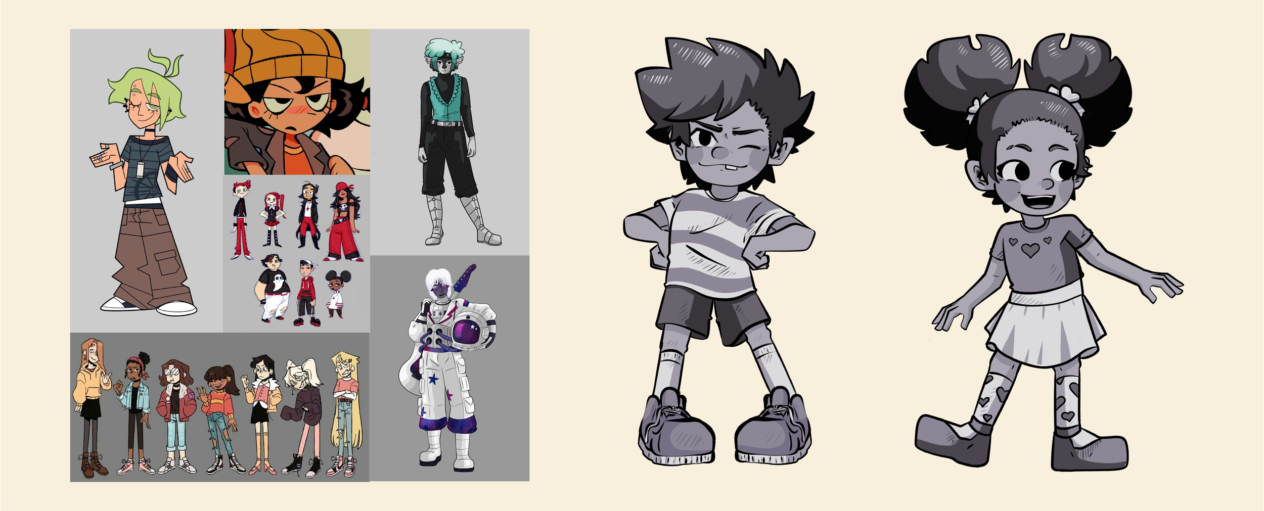 Alongside the style that the client had initially asked for, I provided a second illustration style pitch that combined elements of my own art style with a much more cartoon-based look that could be better utilized for a wide range of ages and body types. This style that I pitched was what the client decided to move forward with, and I began developing concepts for the rest of the cast of characters.