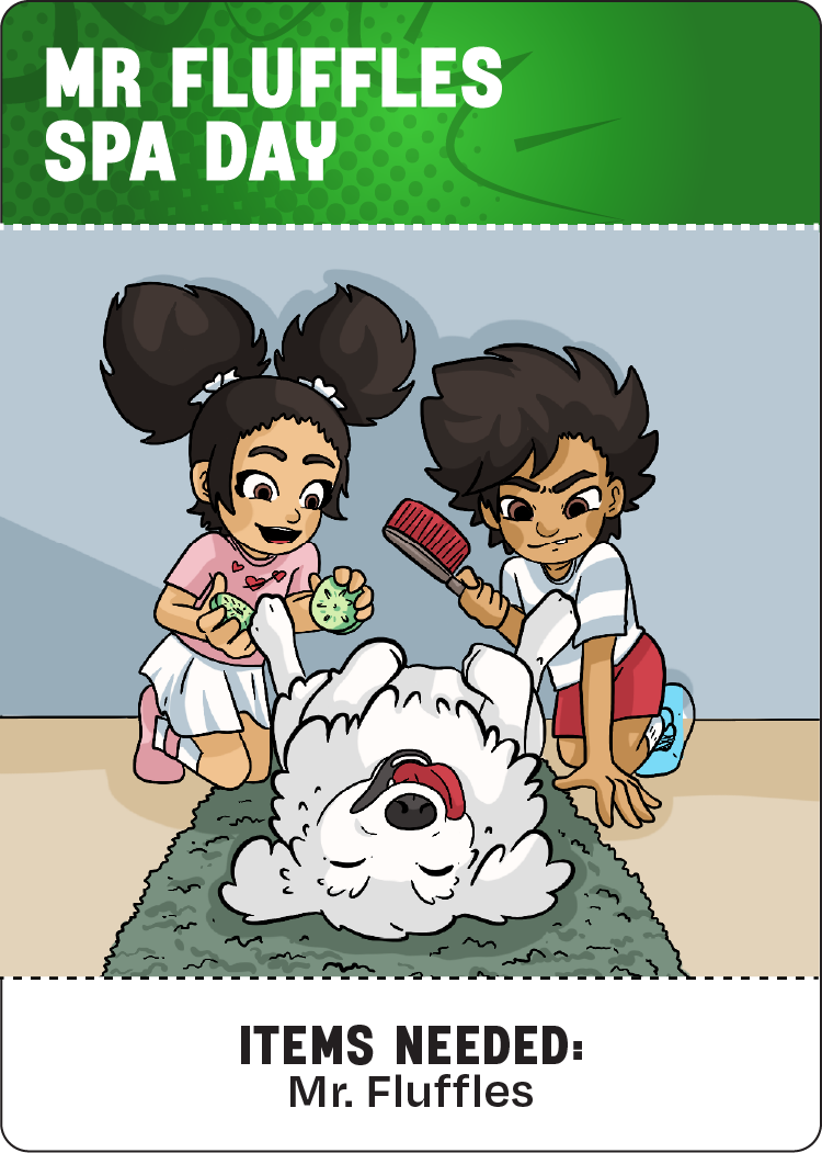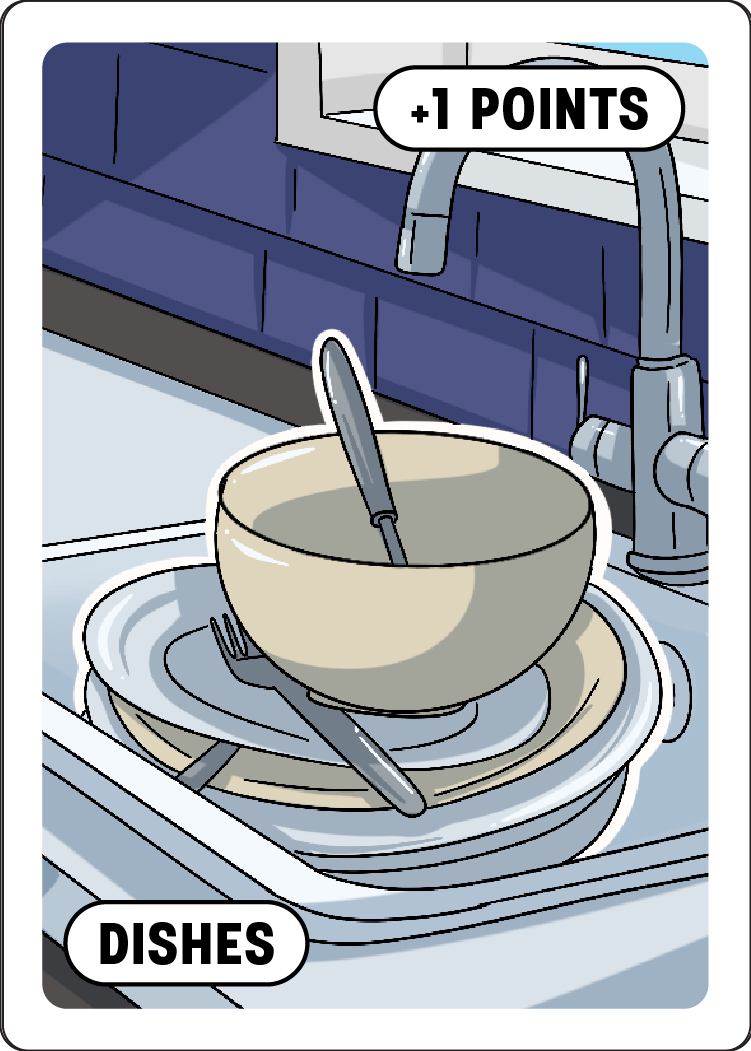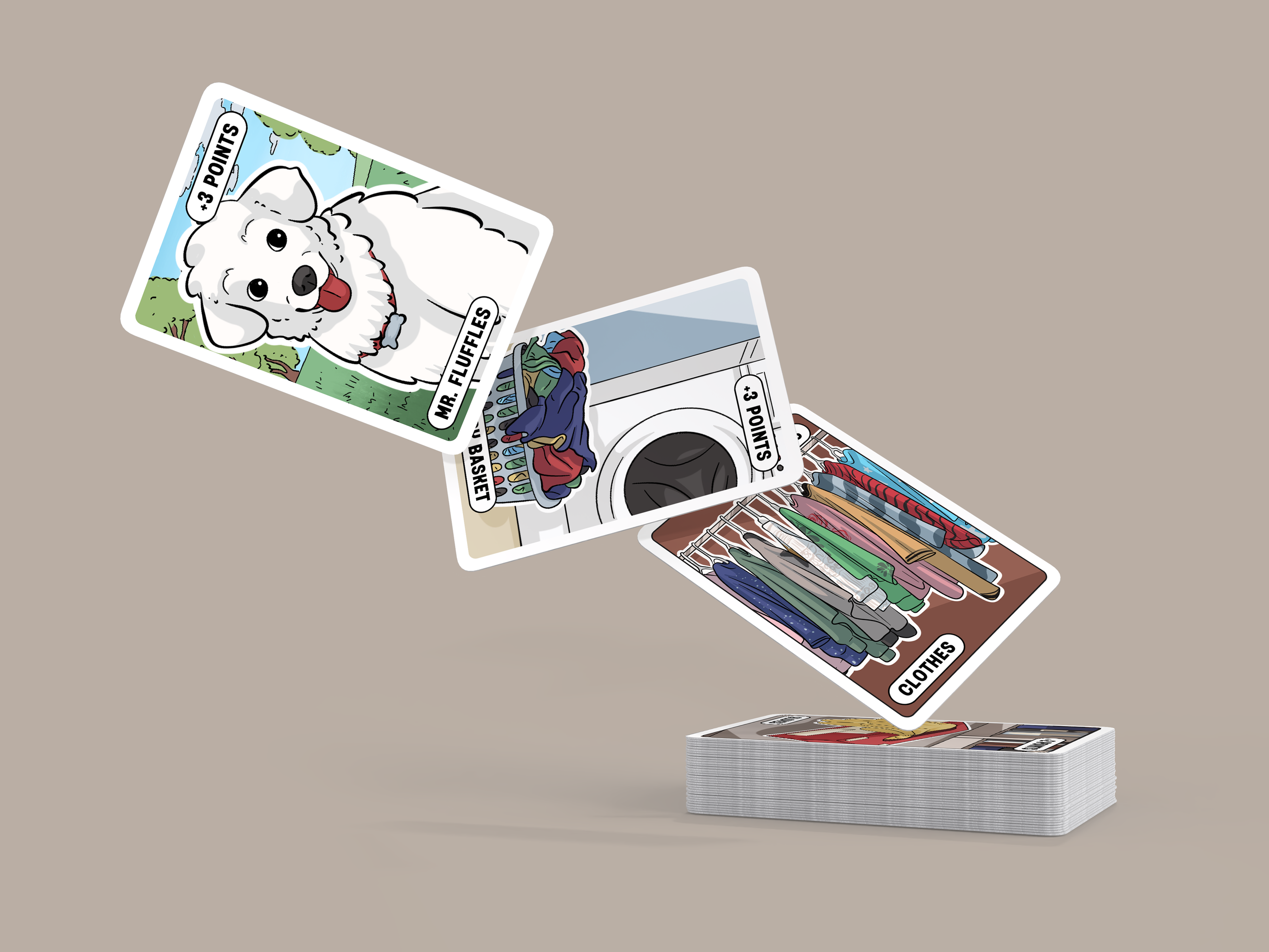 With the characters finished, the next step was to begin creating the illustrations for all of the cards, ranging from the items that players can collect to complete chores, to the chore cards themselves, action cards, role cards, and bonus cards. The following gallery shows the finalized illustrations for various cards I’ve created for the current version of the game. The client and I worked collaboratively together to develop the layout for the cards with the client’s provided body text and chosen font preferences. These illustrations are fully rendered scenes and interactions, and took the bulk of my time spent working on this project!