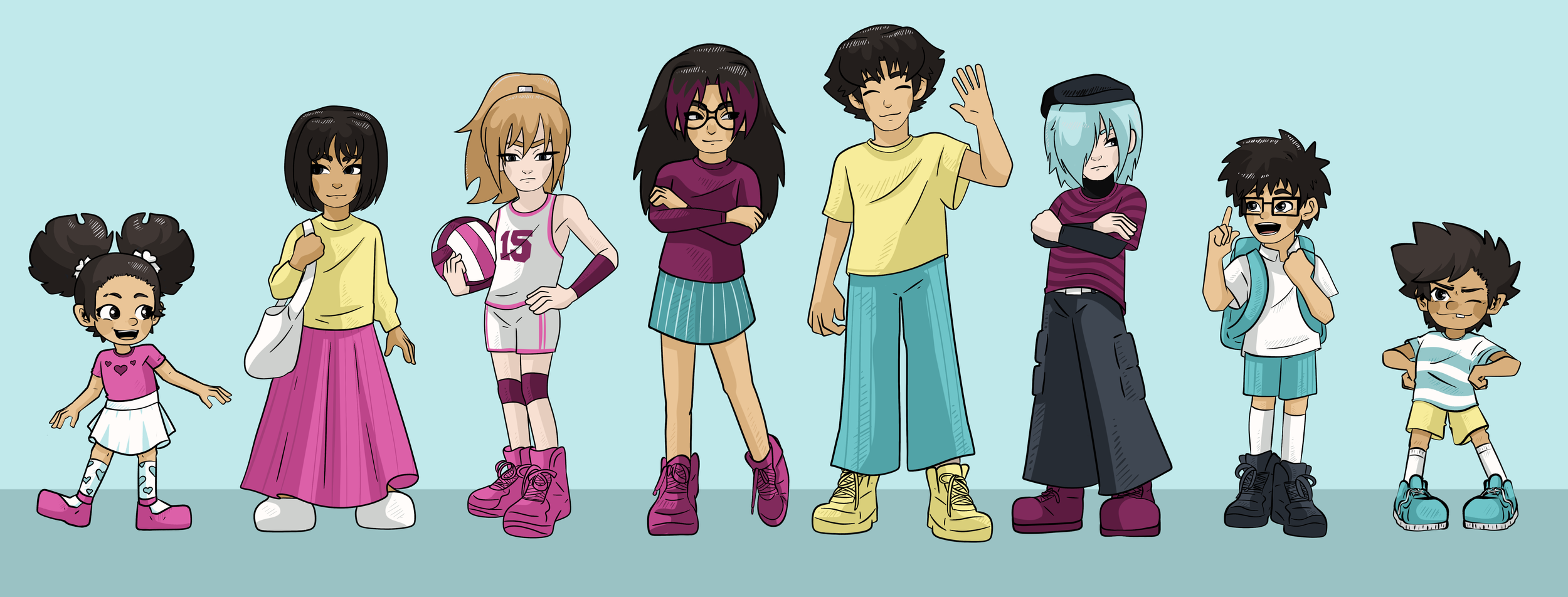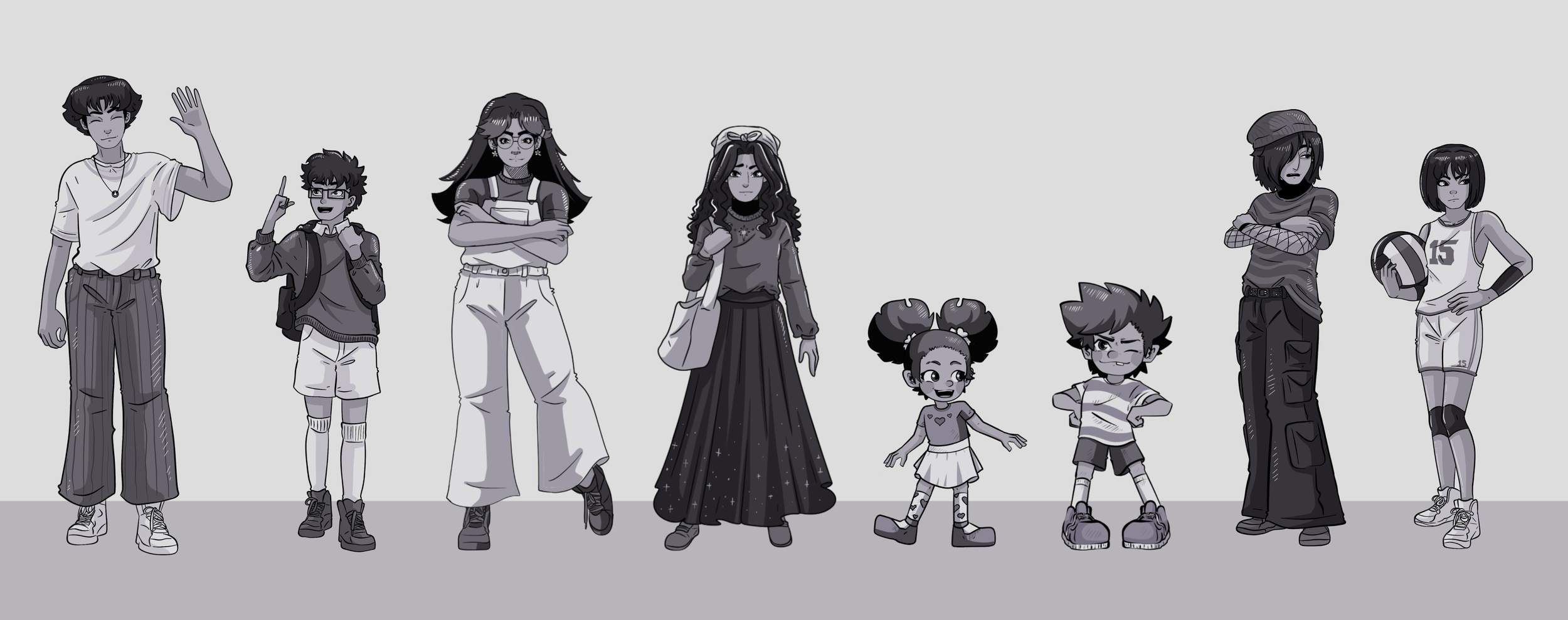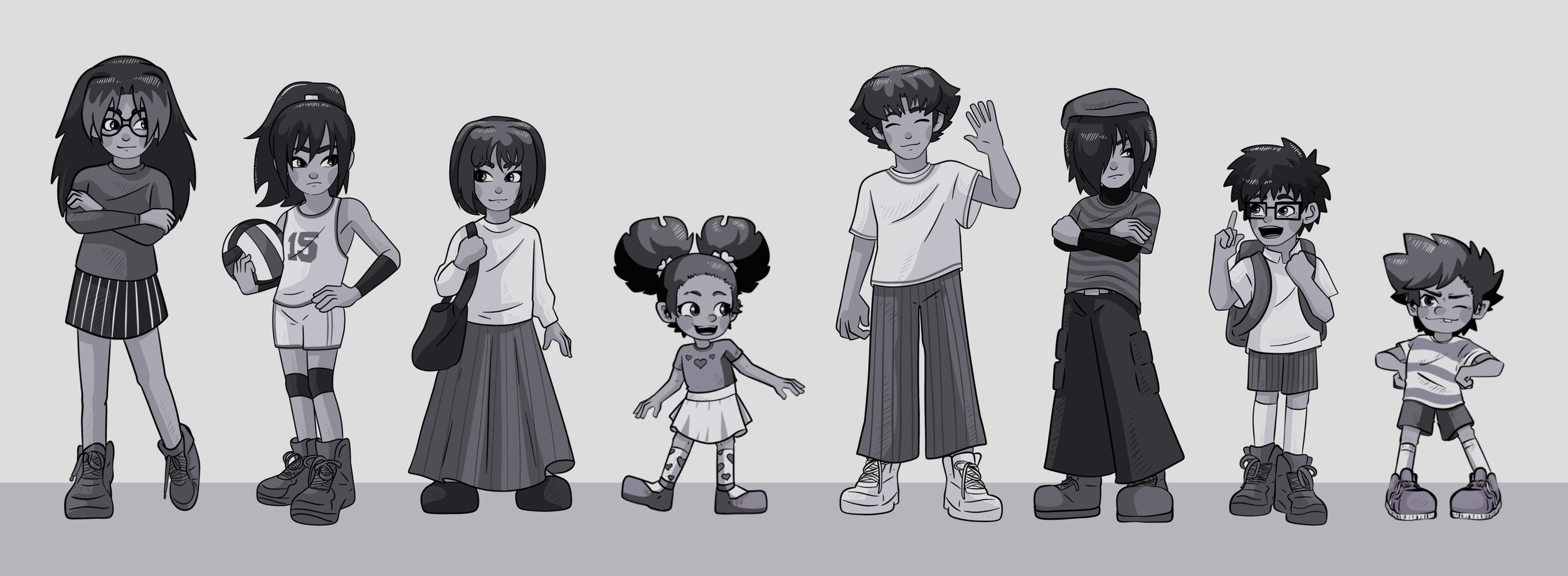 Below is the initial set of black and white illustrations for the entire family - From left to right, we meet the eldest brother, middle brother, oldest sister, middle sister, the youngest sister and brother, the step brother, and step sister. However, these renders didn’t exactly match the style I had conceptualized for the youngest two siblings, and I worked through several rounds of renders to create a more harmonious style for this cast that still showcased the diversity of heights, ages, and demeanors.