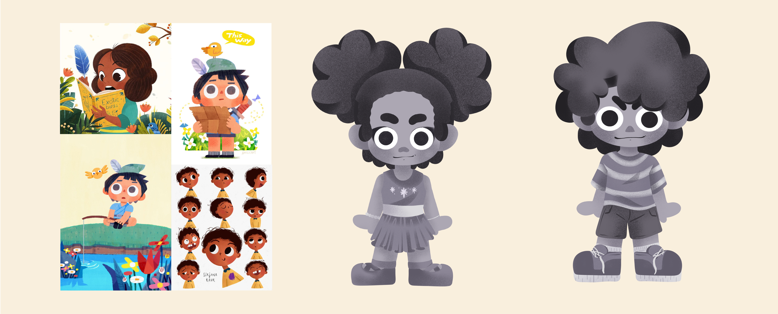The rudimentary concept art for the two youngest siblings above is a style I experimented with derived from these reference images the client provided. While adorable, concerns were raised about how to convey vast differences of ages with a style this simplified, and didn’t align with the client’s additional desires for the game to have a more bold, line-art based, comic book style illustration approach for the other visual elements of the game.